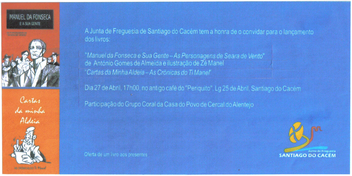 "Manuel da Fonseca e Sua Gente", "Cartas da Minha Aldeia - As Crónicas do Ti Manel" escritos por Antonio Gomes de Almeida e ilustradas por Zé Manel apresentadas no Café do "Piriquito" em Santiago do cacem no dia 27 pelas 17h